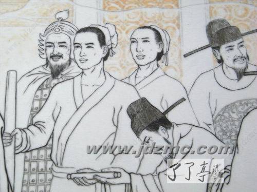 创作历史画,必须对历史主人公作深入的研究。对于宋真宗,我们原来仅仅从“檀渊之盟”中略知一二。他曾经以极大的勇气登上檀州城楼督战,宋军皆呼万岁,士气大振,气势百倍,夺取胜利。但是“檀渊之盟”又要每年给辽国银10万两,绢20万匹,长期以来,教科书中将他作为丧权辱国的典型。在改革开放中,他的“昏君”帽子已被摘掉,历史还其本来面目。“檀渊之盟”中:辽宋为兄弟之国,辽圣宗年幼,称宋真宗为兄。宋每年“助辽”银和绢。每年财政收入达至1亿两的大宋,每年拿出10万两帮助贫困的小弟弟,这算得上促进民族和谐的仁义之举。而作为游牧民族的契丹,从此不再侵扰大宋江山。从景德元年开始,宋辽之间一百余年没有战争,北宋从此走向繁荣昌盛的顶峰。由此而见,宋真宗是非常智慧和宽仁的明君。遥想当年,刚刚取得檀渊之战决定性胜利的宋真宗赵恒,意气风发、踌躇满志,看到昌南镇献上的御瓷,精美绝伦,何等高兴,欣然命名景德镇,成就了江南雄镇,成就了瓷国高峰,成就了千年瓷都。对于依托这个辉煌的名字1000年薪火相传的景德镇人,景德大帝是永远值得纪念的伟大皇帝。