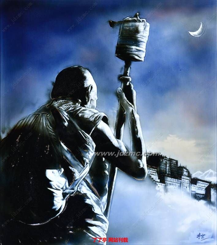 另外,李泉善于捕捉、提炼西藏题材的文化符号并加以强化,将题材的地域特点表现得自然而充分,比如转经筒、经幡、喇嘛、寺庙、藏羚羊、牦牛等等,都有强烈的地域特征,容易形成视觉吸引并让人进入情境。