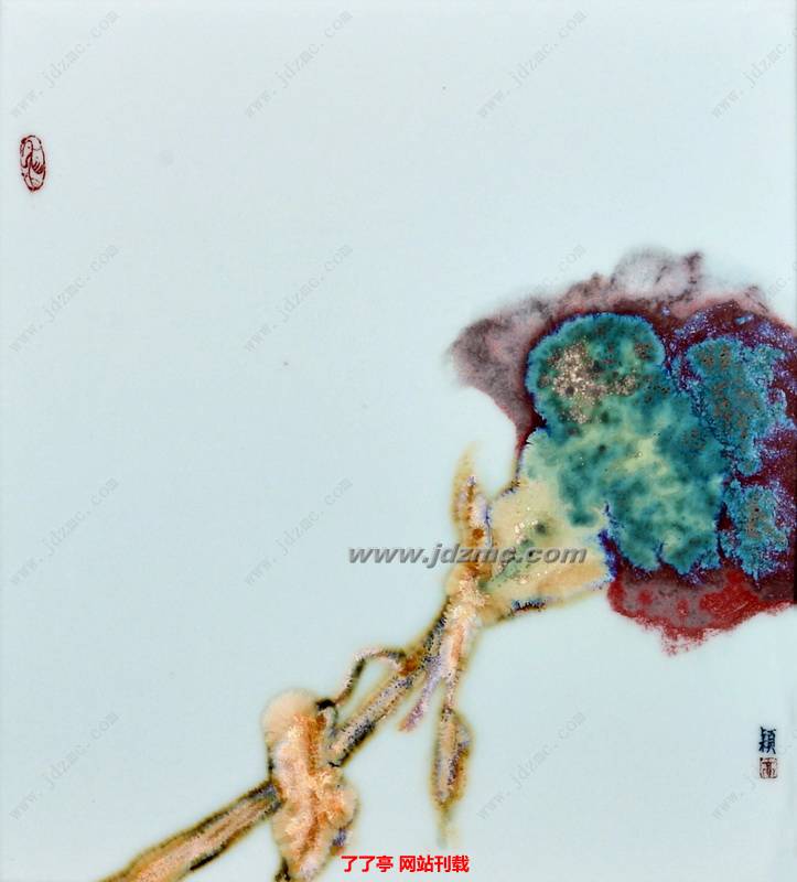 六月,水气弥漫的清晨,阳光轻抚过荷塘,照见那一抹醉心的沉静。一切在瓷板上定格,越加的淡雅、纯粹。画里的荷花忘却了环境的纷扰,抛开了本有的娇艳,诗意的绽放着。画家读懂了它的心,给了它最为干净的空间,它自顾自的开着,再不沾染一丝俗气。