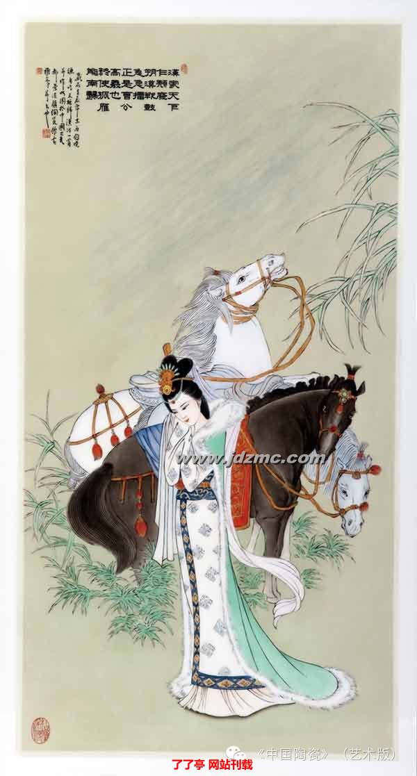 (一)古典传统。程元璋大多数陶瓷艺术作品的画面都是传统的古代名画的作品。中国传统绘画艺术,以其独有的特色和不朽的作品,在中国民族文化宝库中占有极其重要的地位。它丰富多彩,源远流长,博大精深。程元璋在寻求创新的道路上,始终不忘传统。程元璋把古人绘画的经验传承下来,又不断把自己探索创新的经验赋予陶瓷绘画作品之中。他的作品突显古典风格,古典之美。