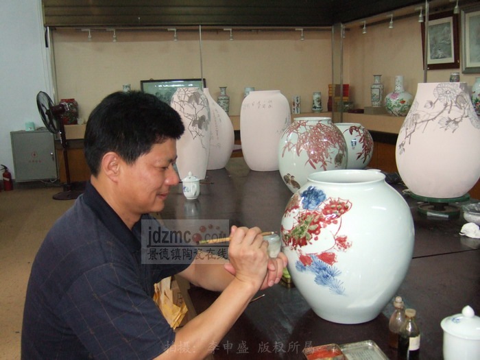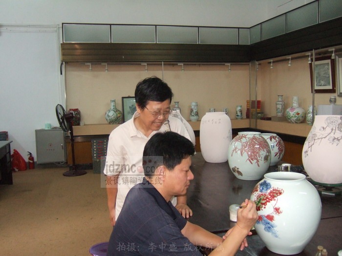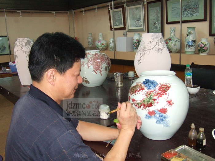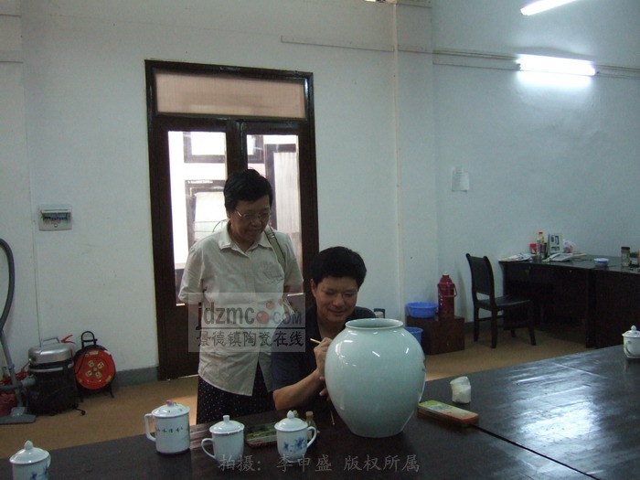 肖振松老师是一个技艺全面的艺术家,其陶瓷艺术作品追求一种清幽凝重的艺术风格,表述了崇尚自然淡泊宁静的审美理想。人物山水、花鸟虫鱼均有涉猎,尤好鱼藻。表现手法多样,其作品常集多种技艺于一体。工于坯体刻划浮雕,釉上料彩与高温釉彩并重,屡获各种大展奖项。 在肖振松老师创作的过程里,陈也君女士一直在和肖老师交谈,感觉到他的创作思维很活跃,对待事物十分认真。并且对很多事情,姿态低调,待人热情,是一个非常不错的陶瓷艺术家。 在这一次2007年度景德镇百花奖的评选中肖振松和姚惠云夫妇共同合作并获得了二等奖和三等奖两个名额。 图中是肖振松老师青花釉里红斗彩的创作画面