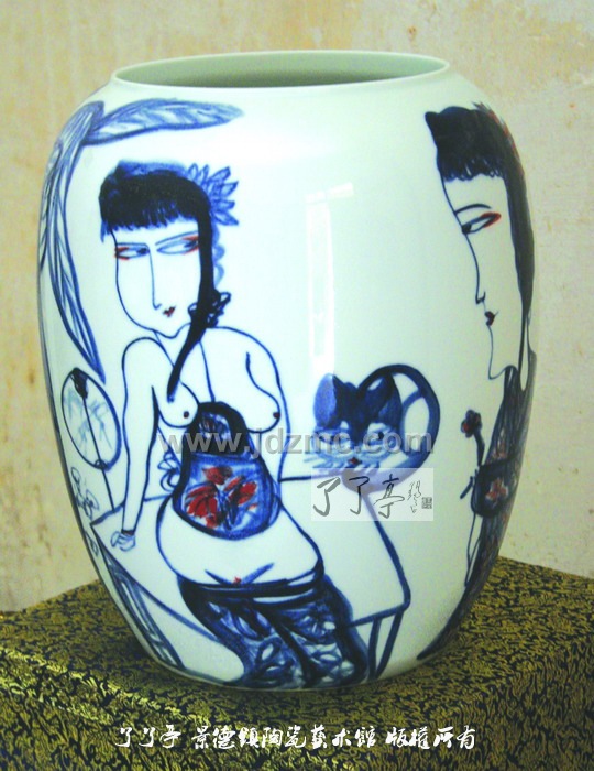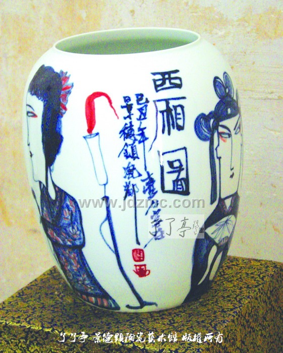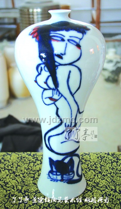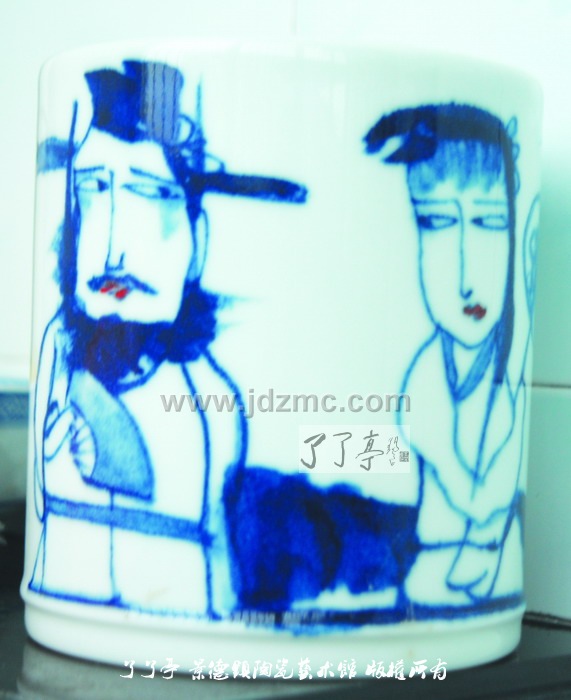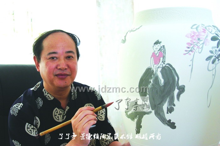 醉瓷 作为一位外来艺术家,潘杰对景德镇陶瓷艺术充满着向往。曾经有人这样评价景德镇,说景德镇本土画家只是工匠,不懂绘画艺术。对这种说法,潘杰说那些人太不了解景德镇了。记得有一年,潘杰在景德镇画了一块瓷板,烧好后,在拿到街上等车。这时,有不少市民围上来观看欣赏,还有些人当场对瓷板画进行评价。这些普通市民的欣赏、评价水准,让潘杰大为吃惊,“哪座城市,像景德镇这样?”潘杰说。 的确,景德镇是座艺术之城。景德镇陶瓷艺术是泥与火的艺术,是艺术与工艺的完美结合。潘杰被陶瓷工艺表现绘画的魅力与神奇所深深吸引。近几年,潘杰又将手指画创作引向了陶瓷艺术品领域。“用陶瓷表现手指画存在着窑变等诸多不可控因素,一窑的瓷器最后能成为正品的不过一半。这是挑战,但这种不可预期也正是这种艺术门类的魅力所在。” 每次来景德镇,潘杰走师访友,与景德镇本土艺术家交流切磋,丰富自己的创作。陶瓷艺术是世界瑰宝,潘杰以古典戏曲人物和历代醉酒诗人为主的手指画是画坛一大特色,其将二者融为一体,焕发出新的艺术风采,让潘杰痴迷沉醉。 回顾30多年的艺术探索历程,潘杰始终遵循艺术第一、品质为上的艺术规则,不图虚名,不求小利。谈及未来的艺术轨迹,潘杰道出了他对手指画的厚爱,他将海纳百川,博采众长,为中国手指画发扬光大和独树一帜而不懈追求。他说,壶公爱酒,更爱艺术,做艺术的壶公,为艺术而醉。 人物简介: 潘杰,1960年5月生于九江市,号师虎堂主。笔名壶工。是中国手指画研究会副会长,中国美术家协会会员,庐山中国画研究院名誉院长,国家一级画师。师从刘大为、陆俨少、舒传曦,重在意趣表现,潇洒自然,秀逸清晰,致力于新构想、新方法之探索。擅长戏曲人物手指画、工笔老虎、牡丹,兼花鸟、人物。艺术特点承潘天寿先生遗风,以指代笔,潇洒自然。戏曲人物技法师承画坛大师关良,古厚天然、笔墨淋漓。