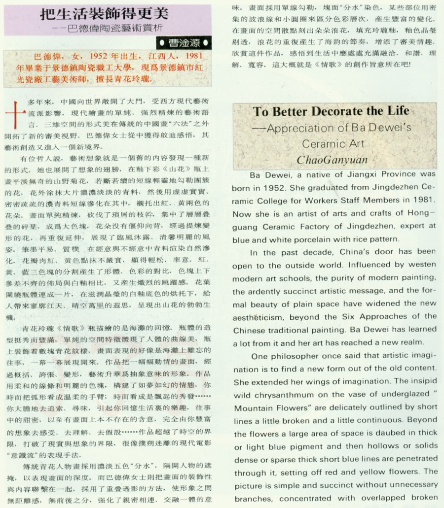 有位哲人说,艺术想象就是一个旧的内容发现一种新的形式。她也展开厂想象的翅膀,在釉下彩《山花》瓶上舀平淡无奇的[U野菊花,若断若续的短线轻灵地勾勒团簇的花.花外涂抹大片浓浓淡淡的青料,然後用虚虚实实、密密疏疏的浓青料短线渗化在其中,衬托出红、 黄两色的花朵。画面单纯精炼,砍伐了琐屑的枝干,集中了层层叠叠的碎叶,成为人色块.花朵没有偃仰向背,经过提炼变形的花,再重复延伸,展现丁临风沐露、清馨明丽的风姿。笔墨平易.质朴 在经意与不经意中青料渲染自然渗化。花办肉红,黄色点抹不严实,显得轻松、率意。红、黄、蓝二色块的分割产生了形体、色彩的对比,色块上下参差不齐的布局与白釉相比,又产生炽烈的跳跃感。花叶围绕瓶体连成一片,在滋润晶莹的白釉底色的烘托下,给人带来寥廓江天、晴空万里的遐思,呈现出山花的勃勃生机。