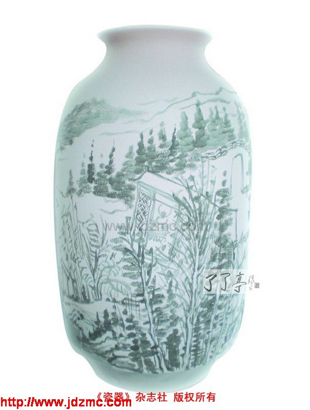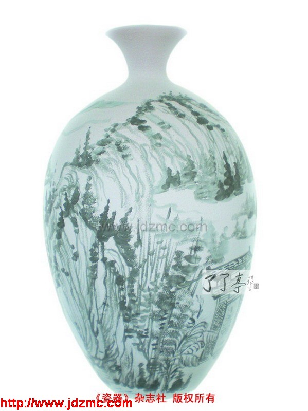 陈琳滨主要涉及的是青花山水创作。国画山水是陈琳滨的本行,他用国画的笔触,运用到陶瓷绘画中,在他看来,在陶瓷上绘画是一种体验、一种感觉、一种很舒服的享受。与景德镇陶瓷艺术家相比,陈琳滨的创作少了一种压力,那就是他画的作品不用考虑市场,他所有的陶瓷作品都作为自己的收藏,或送朋友,这大概就是陈琳滨所说的“玩”与“享受”吧。