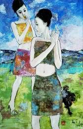 在他众多的作品中,以人物为主的题材占多数,表现人物似乎是他所钟情的。出自他笔下的女子少了一分妩媚,多了一分质朴,“清水出芙蓉,天然去雕饰”,透过画作本身,我们感受到的是来自草原上纯净自然的美。