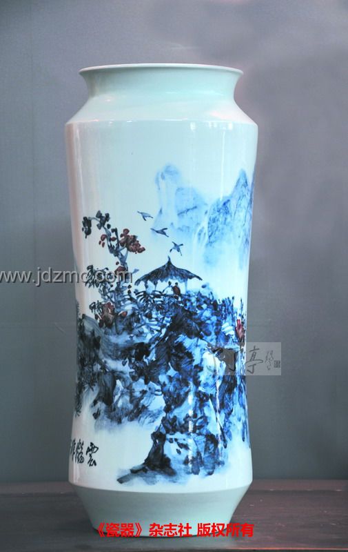 在纪长岭的工作室里,陈列着许多形态各异的陶瓷艺术作品,这些作品中尤以青花山水绘画最引人注目,其运用深厚的国画功底,注重在传统笔墨的基础上融入现代审美意趣,形成了古为今用、中西合璧的绘画风格。看纪长岭创作的写意青花山水,呈现出一种气势磅礴、壮怀激烈之感。在他的笔下,青花山水被赋予了鲜活的生命力,形成了纪式独有的风格。