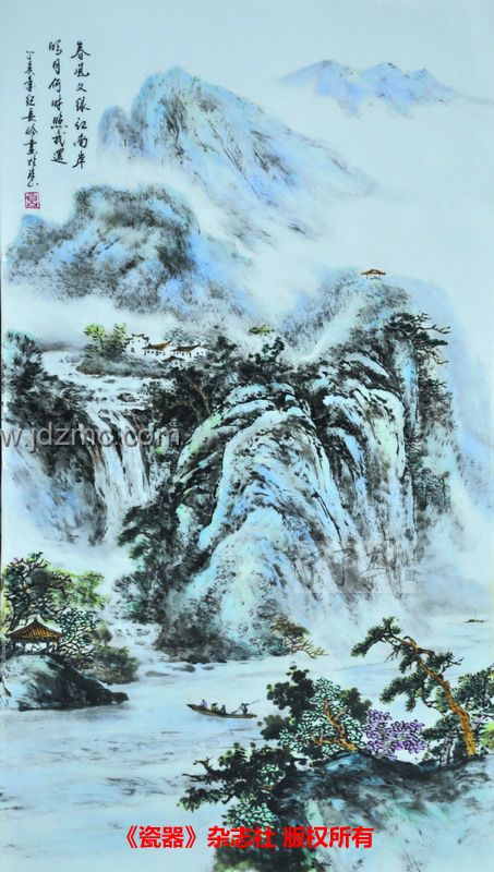 纪长岭的山水瓷画从表象上看,仍是再现型的写实绘画,然而,细心品味他的山水瓷画,不难把握他的创作意图和艺术轨迹。他善于把自然山水的感性形态,与“道”的心象情趣交融为一体,是客观物质对象与主观意象高度融合,是“物”中显“象”的形,无论是一山一水,还是一草一木,在画幅之中都充满了勃勃的生机,包孕着淡淡的灵趣,从而实现了他对传统中国山水画审美价值的追求。