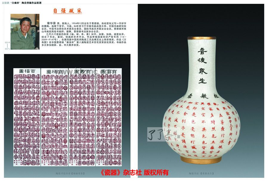 (了了亭 景德镇陶瓷艺术馆 资讯,本文刊载于《瓷器》杂志社 残联增刊)——陶瓷印章是在陶瓷与印两大文化的融合中出现的艺术品,是刀、土、火不断融合与发展的产物。章华霖在精致光滑的瓷板上,让书法作品飘逸灵动,让人物花鸟栩栩如生,在其作品中赋予了审美内涵和精神情趣,运用个性化的语言和材料手段来表现富有个性的陶瓷印章艺术作品。陶瓷印章的装饰就是打破传统观念中印章的材质与装饰,将人们对陶瓷印章自由的情感发挥到极致。所以陶瓷印章表面的着色装饰本身就是强调视觉冲击力的,这才能激发人们的解读兴趣,加强人们对于探寻陶瓷印章内涵的兴致,就像中国画中的留白处理一样,给人一种宁静舒缓的氛围。