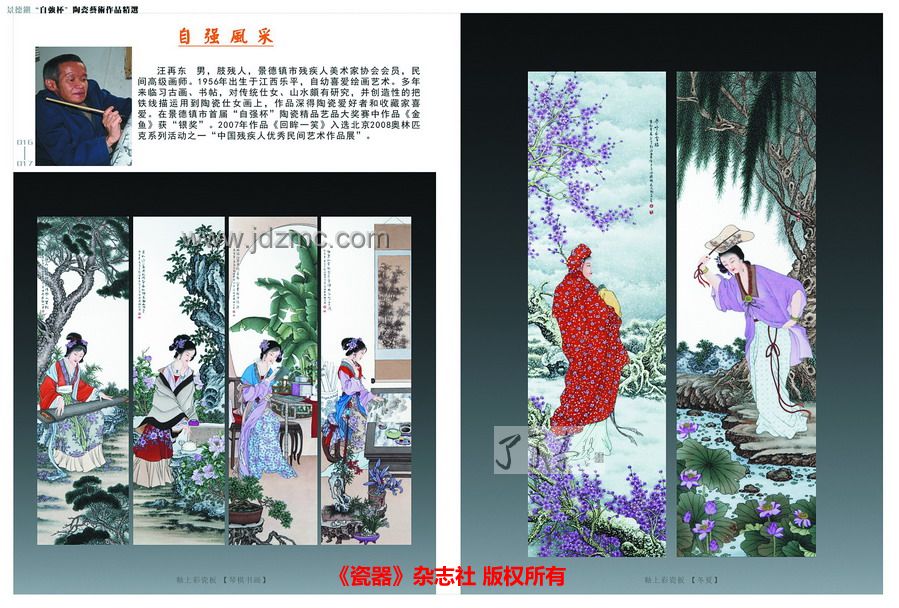 汪再东 男,肢残人,景德镇市残疾人美术协会会员,民间高级画师。1956年出生于江西乐平,自幼喜爱绘画艺术。多年来临习古画、书帖,对传统仕女、山水颇有研究,并创造性地把铁线描运用到陶瓷仕女画上,作品深得陶瓷喜好者和收藏家喜爱。在景德镇市首届“自强杯”陶瓷精品艺品大奖赛中,作品《金鱼》获“银奖”。2007年作品《回眸一笑》入选北京2008奥林匹克系列活动之一“中国残疾人优秀民间艺术作品展”。