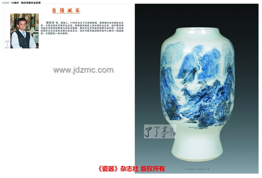 (了了亭 景德镇陶瓷艺术馆 资讯,本文刊载于《瓷器》杂志社 残联增刊)——胡民华爱好书画艺术,长于研修。在创作过程中善于汲取前人的经验和艺术精华,师古不泥,大胆创新。经过反复锤炼,逐步形成自己独特的艺术风格。主张“艺术源于生活”,擅长观察思考、提炼、升华,从平凡的生活中挖掘素材,并获取创作灵感,创作出大量为人称道的优秀作品,取得了很高的艺术成就。他的作品青花瓷瓶《梦想春兰》可谓是抽象性的山水画,其作品雍容大器,古朴隽永,气势磅礴,意蕴悠长,颇受大众及国际友人的喜爱和青睐,具备较高的艺术品位。