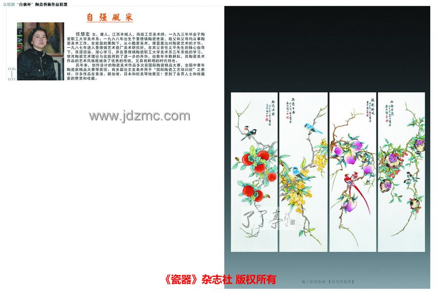 (了了亭 景德镇陶瓷艺术馆 资讯,本文刊载于《瓷器》杂志社 残联增刊)——任慧宏的釉上粉彩瓷板画《花鸟四条屏》为传统粉彩,以祥和的题材勾勒出四季花鸟和谐与温馨的画面。用笔大胆从容,干脆利落,清疏雅淡,造型准确,设色秀丽,足见画家写意花鸟画的精妙高超表现力及清新雅致、别具一格的绘画风格。不但釉彩柔和,色泽多样,而且通过渲染丰富了表现方式,能用于各种题材的内容,产生和纸帛上的国画相似的效果。任慧宏描绘的花鸟草虫的生态,布局简洁,色彩清雅,用笔用墨都是那样自由自在,放松闲散,疏落自然。