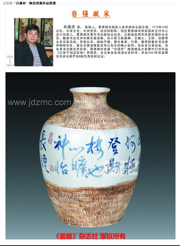 (了了亭 景德镇陶瓷艺术馆 资讯,本文刊载于《瓷器》杂志社 残联增刊)——陶瓷与书法艺术虽是两门独立艺术,陶瓷是泥与火的艺术,书法是笔含墨的艺术。艺术都是相通的,陶瓷与书法原本属于独立艺术,然而艺术间不乏契合。肖建虎擅长陶瓷书法创作,在陶瓷上运用综合性装饰手法还原行草本色,他的作品陶瓷书法《岳阳楼记》采用釉上和釉下的结合,陶瓷同书法艺术的契合给欣赏者感觉无疑是锦上添花。作品充分利用书法的形式美和陶瓷材质美在文化内涵和形式上的联系,和谐而自然地结合起来,为陶瓷书法艺术的发展开拓了新的境界。对两者成功的驾驭,在于对两门艺术的解读和深掘,而后达到综合艺术的完美和统一。