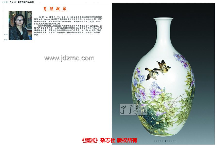 (了了亭 景德镇陶瓷艺术馆 资讯,本文刊载于《瓷器》杂志社 残联增刊)——杨鹏被诸多人评价为才女,从她的作品中确实能证明这点。釉上彩瓷瓶《百年好合》简洁、大方、清新、素雅,极端的形似逼真、色彩渲染淡雅纤丽,我们体会到一种细致的情感、朦胧的意境、高雅的格调。作品中笔法的运用妩媚刚劲,婀娜道逸,用笔挥洒。杨鹏的落笔度法严谨,墨色温和而秀润,使得整幅画面达到了有机的统一,画面在效果上温馨宁静,完美得令人窒息。而只有更具体更细致的体验和理解,才能生发出更具体更细致的绘画语言和感人意境。她作品中的一花一鸟、一枝一叶都有非常细腻的表现和情绪,形象是具体而生动的,情绪是细致和丰富的。这一切总体营造了一种温馨而淡雅的意境。