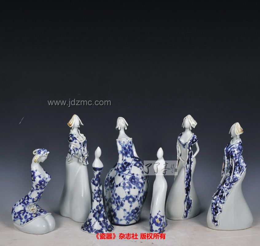 (了了亭 景德镇陶瓷艺术馆 资讯,本文刊载于《瓷器》杂志社 残联增刊)——《青春姿态》的创作灵感来自于中国传统青花元素,这件雕塑作品以夸张的手法塑造婀娜多姿的东方美女。美乳、蜂腰、肥臀……美女们姿态万千,或跪、或立、或回眸……服饰以花中气节最高坚“梅”为主要画面,或点缀于裙摆、又或于胸襟。造型各异可分开摆放亦可成为一个群体。明亮的色彩搭配与抽象的人体造型融合在一起,充分显示出东方女性含蓄内敛的高雅气质,既有浓郁的民族时尚风味,又浅韵着青春现代感。