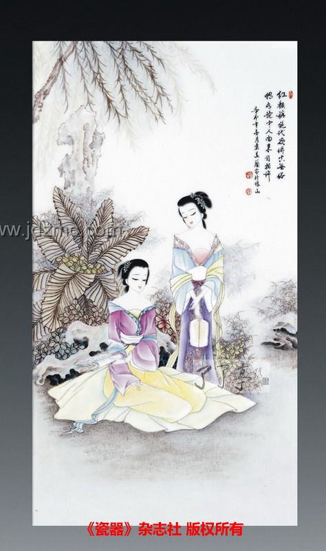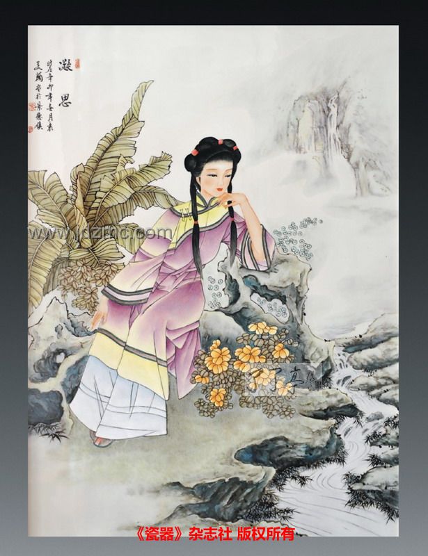 (了了亭 景德镇陶瓷艺术馆 资讯,本文刊载于《瓷器》杂志社 残联增刊)——其人物动态婀娜多姿,造型准确,面容俊俏,尤其是10多年的图案功底,使作品线条稳健,色彩淡雅光洁,其传统仕女作品中独树一帜。她以轻描淡写的笔调,静谧雅丽的色彩,工致茂美的图案,艰难而有成效地走出了一条属于自己的艺术道路。