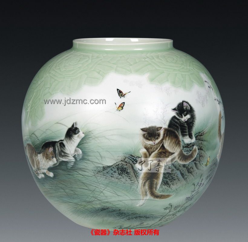 (了了亭 景德镇陶瓷艺术馆 资讯,本文刊载于《瓷器》杂志社 残联增刊)——猫是我们最常见的宠物,好奇心强、灵动活泼的小猫最是招人喜爱。作者的猫画神趣宛然,这离不开他对猫的体形、情态和品性的熟悉和把握。猫的稚气灵动在活动中体现得最充分,表现动态的猫,除了形态,更重要的是画好眼睛。猫眼睛的亮与暗,眼光的强与弱、聚与散,作者都是通过眼形的大小长短,用什么颜色,用色的多与少、深与浅,综合考虑,精心描绘,这已经进到技法的层面。对绒毛质感的表现,猫画以工笔居多,充分发挥毛笔笔毛柔而韧、细而密的特点,对猫细软蓬松的绒毛的表现令人称道。加上综合装饰影青雕刻,更加衬托猫的灵性。