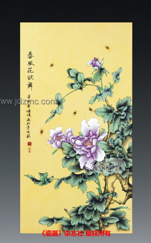 (了了亭 景德镇陶瓷艺术馆 资讯,本文刊载于《瓷器》杂志社 残联增刊)——瓷板的底色釉为黄釉,色彩鲜艳,极易映入眼帘,黄色是中华民族皇室尊贵的象征,同时它也是中华民族的主色调。直至现在,它和红色都是中国的主色调。黄色的灿烂、辉煌,有着太阳般的光辉,象征着照亮黑暗的智慧之光,又象征着财富和权利,它是骄傲的色彩。瓷板的主体画面为我国的国花牡丹,大小不一的三朵紫色牡丹争奇斗艳,在绿叶的衬托下更加富贵而娇艳,引得蜜蜂在芳香的花丛间翩翩起舞。这样一幅作既有品位、又美观并具有装饰性的工艺作品,摆在家中,给室内装修画龙点睛的同时,又显得富丽华贵,古色古香。