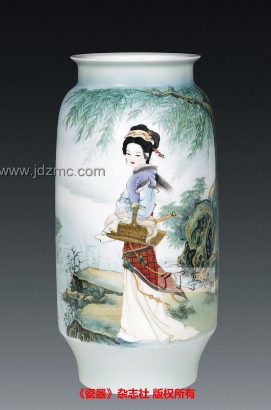 (了了亭 景德镇陶瓷艺术馆 资讯,本文刊载于《瓷器》杂志社 残联增刊)——画中人物比例得当,注重人物表情、性格的刻划。轮廓、衣纹线条流畅,山石、树木、乃至人物衣饰有平涂,有皴擦。瓶上人物图案栩栩如生:画面绘古代美女西施臂挽纱篮款款走来,表情温婉而楚楚动人。衣着线条简洁色泽淡雅,头饰花纹彩巾体现了古典仕女那窈窕清丽、纯洁温文、冰清玉洁的完美形态。背景柳叶飞扬,整幅画面动静结合,色泽协调,十分完美。