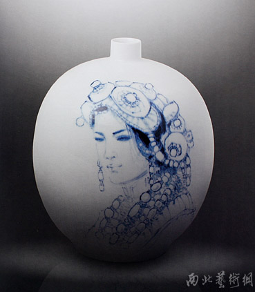 对传统文化根系的追寻是鸿宾作品的又一魅力。生活在当代,城市文明的快速扩张挤压着所有的地球生命,失去家园是全球性生命状态的公用语。鸿宾也一样,他是数以亿万失去家园者中的一个,他出生于西北内陆的古丝绸之域,却举家客居深圳湾畔,属于当代断根一族。诗人里尔克说,无家可归的永恒性,夜宿在我野性的心房。德国批评家本雅明发明了“灵晕”(Aura) -词,用以阐述古老的艺术品所具有的神秘内蕴,“灵晕”其实正是乡愁的一种折射,它是对于神秘失落的文明的怀颂。石子创作过一组彩陶,表现的是藏域世界的坚砾质地和藏地人的俗世生活。数千年前,吐蕃人正是沿着石子故乡的那一条迷茫的砾石路翻越过念青唐古拉山脉,进入到西藏腹地,数千年后,活在当代的青花人鸿宾用他的这一组作品表达着对古老而幽远的西域家园的强烈思念,同时也启动了我们对传统文化根系寻找的想象。与其说鸿宾的这一组高温色釉是西域生活的风俗呈现,不如说它们是对“看不见的亲人”和“回不去的故乡”的祈祷仪式,其中富含着当代人家园精神的强烈诉求。