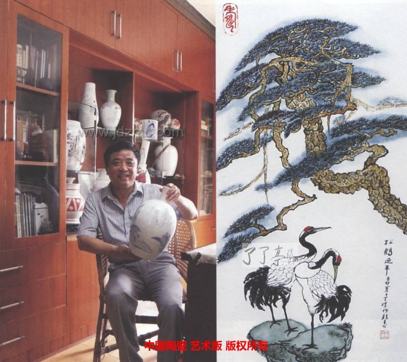 闲暇之余,王璜经常在宣纸上挥毫泼墨。这是他的兴趣爱好,同时,良好的绘画修养练就了其瓷绘创作的扎实功底。如与父亲王锡良共同创作的一幅国画作品,颇见笔墨之功力,极具文人画兼雅逸之致。画面亭台矗立,坡上奇松虬曲,一老翁柱杖立于坡上观山景。构图左右对称,笔墨简括写意,以浓笔表现山石的厚重感,同时注意用淡笔来推开画面景物的空间。松干疏斜,松针勾勒之后再行晕染,以示浓密之效果。相较于描绘之物象,中国画更注重深刻意境的表达。王璜深悟国画之至理精髓,将文人画之妙境表现得淋漓酣畅。而书于画面右上角的诗: ”涂成一片石,安上一棵松,加上小亭子,再请一诗翁。”成为画面的点睛之笔,诗与画相生相形,妙趣横生。