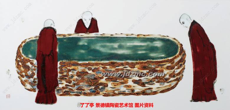 陈少岳的作品很少命名,他甚至在满构图的作品里常常难以找到落款的角落。简单描述一下四块瓷板的画面内容:一个在风雨中骑自行车的少年,一个斜躺在海滩上晒日光浴的女人,几个光脑袋的出家和尚,还有一潭被作者认定为带有宗教情感和仪式的湖水,都有些非主流,也都有些意思。