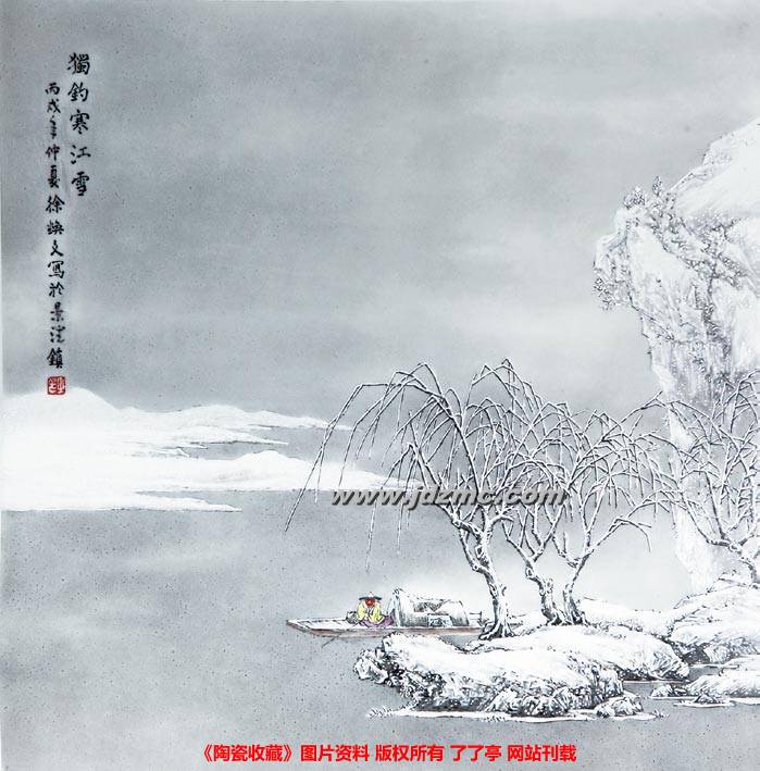 “八景”以创新为主,都是山水,表现瓷都新面貌。毕渊明、陈耀星、我、施林淦、汪少平、邹国钧、邓必浩等联合创作于1961年冬,其中我做了三块,分别是《昌江瓷艇》、《古城新貌:浮梁县》和《高阁临江》。八块板子都是毕渊明做诗、题字。这八块板子,当时无偿送给市政府,“文革”动乱中流失了四块,其余由政府在2008年捐赠给景德镇陶瓷馆收藏。当时一群人之中,只有我还健在,怎不让人感慨?退休后,自己一直放不下手中笔。1990年创作的《庐山风光》瓷板为江西省政府赠香港名人沈炳麟先生的礼品;1991年胭脂红《秋山行旅图》87厘米薄胎碗(当时为景德镇最大的),瓷厂在北京卖了12万;1995年设计的“井岗山主峰瓷盘”为中央组织部和江西省委作为礼品赠予中国科学院和中国工程院院士,本来找我女儿徐硕做,但她到世界妇女大会上做表演去了,领导就找到我……还有许多作品,难以一一回忆了。