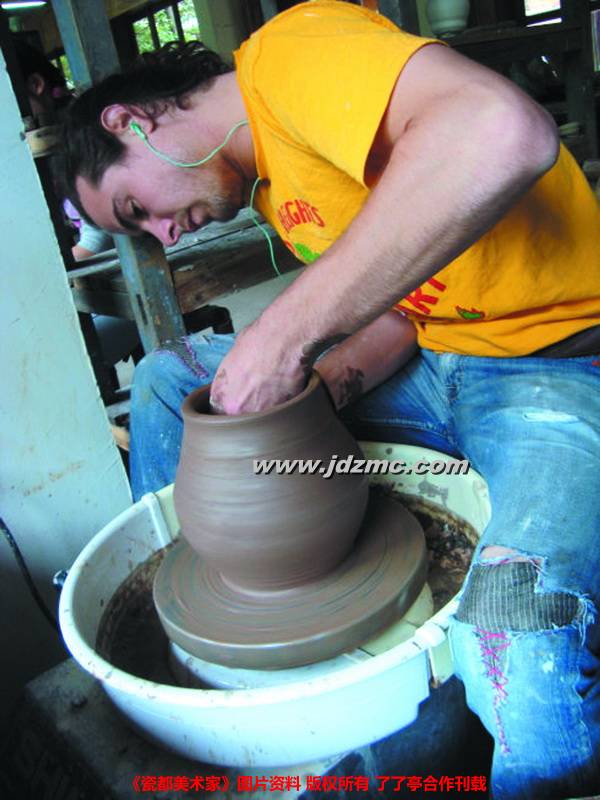 景德镇三宝国际陶艺村工作室内,美国青年Chaes Gamblin在拉着一个坛状造型的坯。隔着几个坯架的不远处是工作室的大厅,一张茶几边,两位老板正围着李见深,细枝末节地介绍着他们的烤花炉和拉坯车,希望摆在三宝让陶艺家们试用。