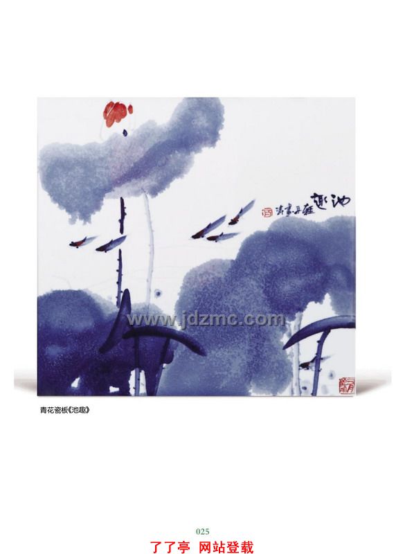 王锡良:对,这样的艺术处理是非常到位的,陶瓷绘画不但有着对国画笔法的要求,而装饰效果也是一定要的。有的外来国画家只是将国画照搬上瓷画,这样做是失败的。您学过版画,在装饰上具有很好的功底,点线面的处理和分布都符合形式美的规律,这样就在国画笔法之外又有了一种装饰味,构图和浓淡色调都处理得很好,这正好符合陶瓷绘画的艺术特色,您的作品很高级。