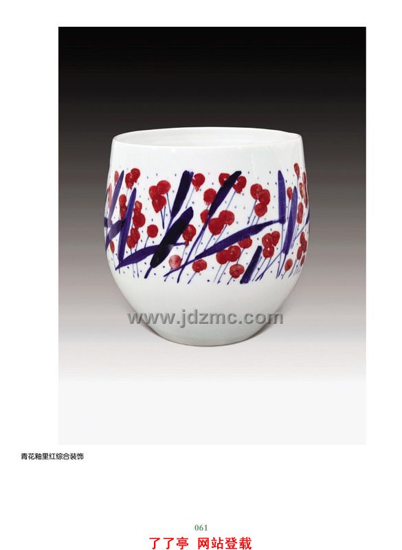 其实我最喜欢看的还是陈先生画的《山卉》之类的青花釉里红作品。其釉里红点垛的花型,配上青花料状写的枝杈,分明是景德镇民间青花的形式和改良的“缠枝”图式再现。那点、线、面的视觉冲击力,有线迹的细腻,有块面的凝重,有疏密的对比,有虚实的互衬,有在似与不似间溢发出的个中韵律。传统的缠枝纹讲究的是花型刻划工细,枝叶缠绕变型,为二连方,三连方联系。古有缠枝莲、缠枝菊、缠枝牡丹、缠枝宝相花等等。而陈先生却在其作品中,把对传统样式的理解与自己的创作理念有意识地结合起来,给人以“锦密中存其古拙,整庸中寓其高古”的韵律。可见陈先生在研习传统中的悟性,在传承中的新意,给人的感觉是既有传统纹式的文化底蕴,又有现代审美的艺术张力。陶瓷是立体造型的载体,具有典型的三维空间,故因器施画是陶瓷装饰的必备要旨。陈先生的瓷画在讲究笔墨顿挫、连续、勾勒、晕染等技法的同时,也利用陶瓷综合材料及工艺的规范,努力地突破笔墨的局限,通过釉色的流变、釉变和窑变,制造种种肌理效果,以使画面在构成 中产生对比和嬗变的效应。如他利用釉里红绘画的《锦鳞图》,其产生的“不慎鳞鬣,猩红乍绿,宝光烁灼,光彩陆离”的视觉效果,起到了调节空间、强化气氛、纯化情感及幻化心理的作用。这种追求物象的自然美和追求工艺的材质美,构成了他瓷画作品技高一筹的艺术形象。