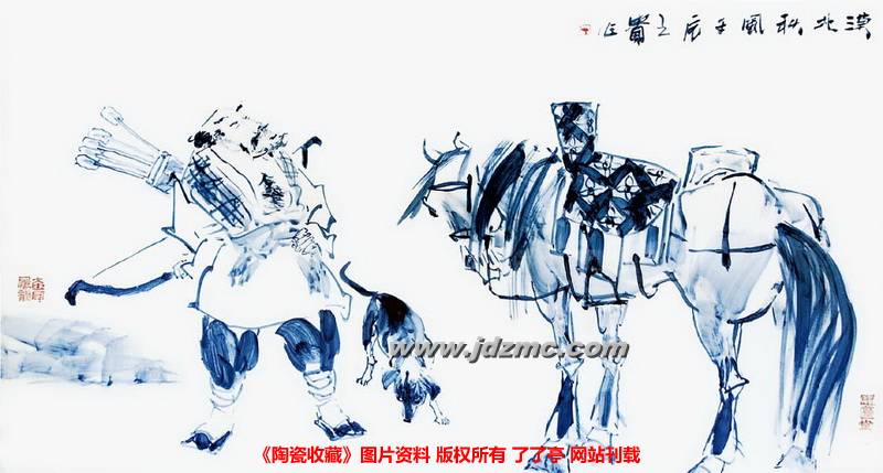 再如其瓷画作品《赏莲图》,图 中描绘古代著名士人周敦颐于庭院中坐看莲花盛开之景,袒衣赤足之状,将周氏的胸怀洒脱、放荡不羁表现得淋漓尽致。 丁之贵瓷画中的士人均是在悠远闲适环境中展现出真实的自我形态,而这正折射着其真诚待人为艺的品质。丁之贵正像一位闲士,抛却名利与世俗,在瓷画中达到人生修养的理想境界。