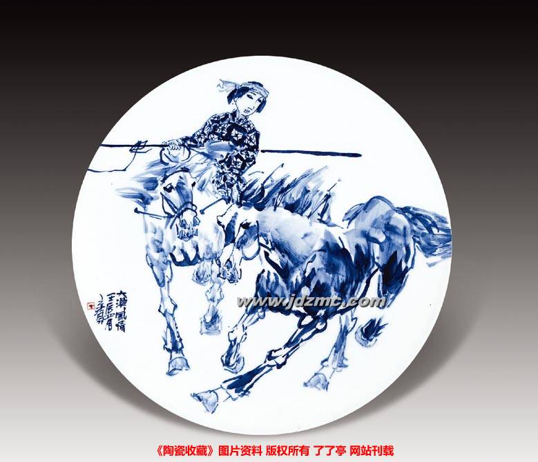 观丁之贵瓷上的马,或淡定神闲地依偎在主人身旁,或陪伴主人玩耍嬉戏,或与主人同悲同喜,而即便是纵马扬蹄,也仍互为呼应,顾盼生姿。观其瓷画作品《秋水丽人》,在蒹葭苍苍,白露为霜中,一位丽人在水的一方放牧马群,骏马聚集在一起,或食草、或顾盼,甚至似窃窃耳语,皆悠然自得、神情怡然。——这是充满闲情的马。