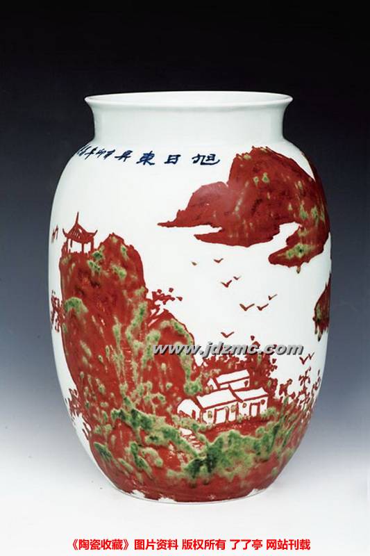 朱昌兴此次带来的陶瓷作品,运用中国写意的技法结合以陶瓷釉下现代青花釉里红为主,作品笔意酣畅,其釉里红发色红中有绿苔点缀,艳而不俗。具有传统审美的雅致和东方气度。其作品构思布局表现形式及色彩有着自己的独特之处。釉里红画面显色老到,红中泛褐,层次分明,不混浊,不浸漫。他说:“釉里红在烧制技术上的难度应当是发展成熟的一大壁垒。釉里红的最大特点是烧制难度大,成品率极低。它是以铜为着色剂,在白胎上直接绘画,在上面施一层釉,铜在高温还原焰中发出了红色。我的作品,经历过许多的失败,但我始终坚持下来了。”