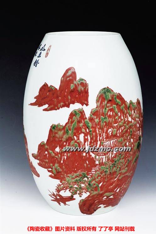 陶瓷绘画美感的追求表现在材质、肌理和表现手法上,把釉上、釉中、釉下等一切可以结合的技艺融汇到一起,用混合、豪放的手法表达意境。高温釉彩产生的色釉肌理效果,在画面上幻化成雾霭,行程妙趣横生的空间体积变化和意境悠远的场景效果,作品强调釉里红的厚重感,视形置景,随形赋色,将一种全新的陶瓷艺术表现形式和色彩语汇带给了观赏者。朱昌兴也逐渐在“红与黑”的墨彩世界中寻找到自己的艺术特色。