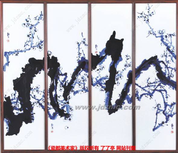 10 多年来,陈轻舟对国画与陶瓷艺术孜孜不倦地追求,攻克了一道道难关,逾越了一个个障碍。他首先从难度最大的釉下彩创作开始,釉下彩,无论是青花、釉里红,都以自己极为深厚的传统功力把对线条的运用发挥到极致。陈轻舟特别重视器型的选用,一个好的器型能够体现一件作品器体造型艺术。陶瓷是立体造型的载体,具有典型的三维空间。瓷画在讲究笔墨的顿挫、连续、勾勒、晕染等技法的同时,也利用了陶瓷综合材料及工艺的规范。陈轻舟不断努力寻找突破笔墨之间的局限,通过釉色的流变、釉变和窑变,制造陶瓷艺术融合国画艺术一体化的效果。这种不断追求探索物象自然美和注重工艺之间的材质美,构成了瓷画作品技高一筹的艺术形象。“艺海大世界,纵横任汝游。黑白浓缩美,杂种也风流”,从一首诗词里我们可以感受到陈轻舟执着的艺术观。在景德镇陶瓷艺术界里,受到瓷坛泰斗、90 岁高龄的中国工艺美术大师王锡良的首肯,称其“作品高级”;在来景德镇的外地艺术家中,被尊称为“陈老”;在经纪人眼中被称为“陈老爷子”。