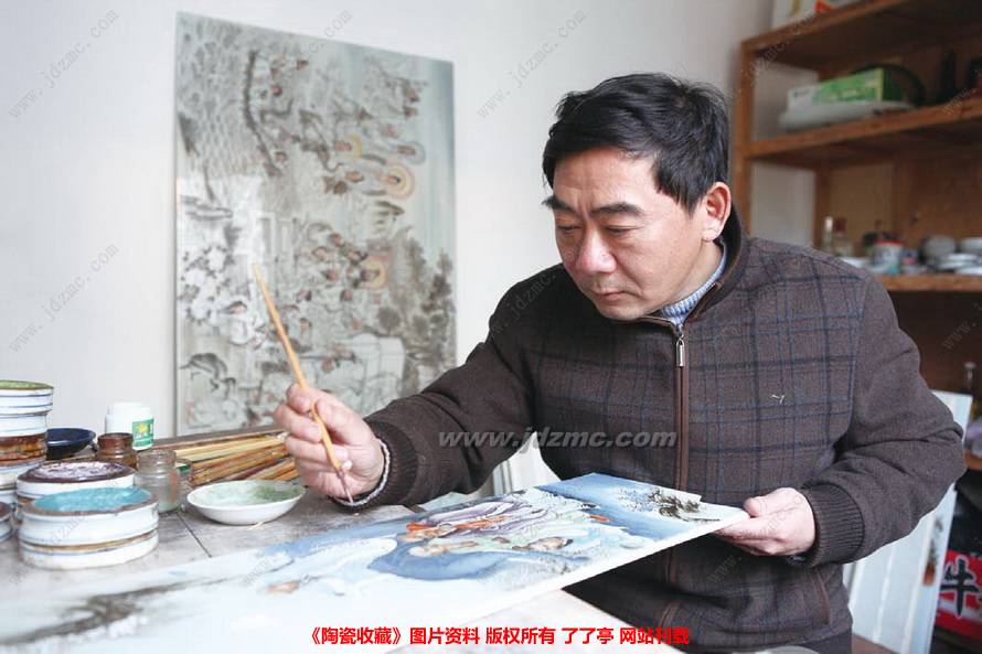 汪荣发,祖籍江西婺源,1960年生于景德镇。中国书画函授大学毕业。景德镇艺术瓷厂壁画研究所副所长,景德镇书画院院士。2011年9月,被世界艺术家联合会授予“共和国陶瓷艺术大师”称号。家学渊源,自幼受其叔公汪鹤亭影响。曾师从著名填彩老艺人孙水生,后为曹木林徒弟,主攻粉彩。性淳厚刚直、淡名利浮华,不尚职称,默默耕耘38年,集填彩、绘瓷于一身,人物、花鸟、山水皆能,被公认为一代粉彩代表人物之一。汪鹤亭(1921—1989),著名绘瓷老艺人孙水生(1918—1992),著名填彩老艺人。王隆夫(1931—),景德镇浮梁人,中国著名陶瓷美术家,第八届全国政协委员,中国美术家协会会员。1995年被授予中国工艺美术大师。