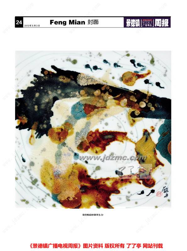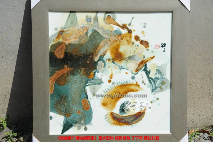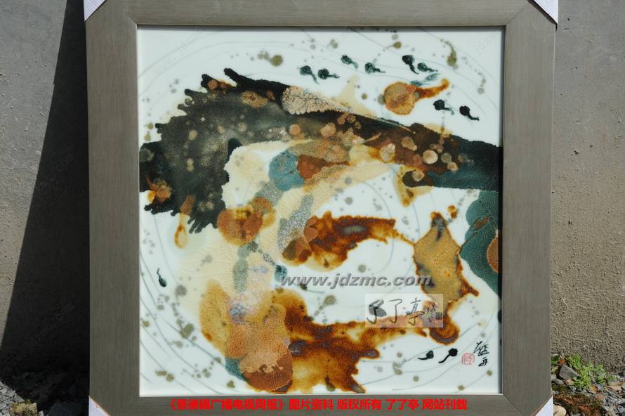 看似随意地,毫无计划性地把釉料不断地泼在瓷板上,许多点状滴落的釉料却无巧不成书地形似蝌蚪,而,墨绿色的一滩犹如生存环境极为恶劣的水潭,这群为了求生存的蝌蚪们,不断地在浑浊的水里游动,以期能获得生存的权利。