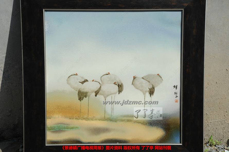 他的工作室里放满了近期创作的“鹤”系列,这些鹤,较以前在宣纸,版画上所表现的安静不同,瓷上的鹤充满了动感,不是翱翔在无边蔚蓝的天际;就是扇动着翅膀准备悦翔天空;要不就是围绕在同伴的周围嬉戏雀跃。一群生机勃勃的鹤在瓷上生动起来。
