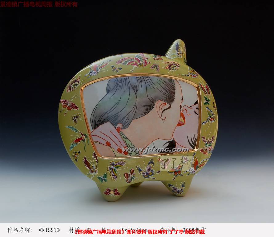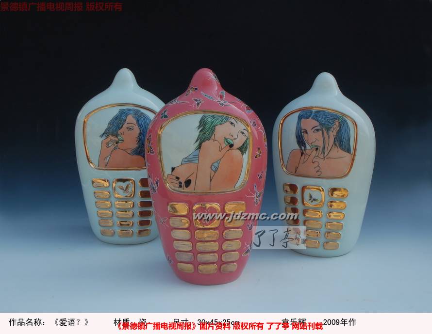 早在06年或是更早些的时候,袁乐辉便尝试着创作了一系列陶瓷的立体作品,如,电视机系列和手机系列。当然,这些作品主要是通过现代的电子产品的泛滥,来表现出这个时代的青年一辈,面对层出不穷的电子产品带来的大量不良讯息的无所适从,从幼稚到成熟的尴尬过度。电视机系列和手机系列的表现手法是直观的,他直接地把那些荧屏上充斥的情色画面通过艺术的手法表现出来,以这样的的手段来思考荧屏前青年一代的迷惑,迷失和满腹惆怅无人诉的忧伤。