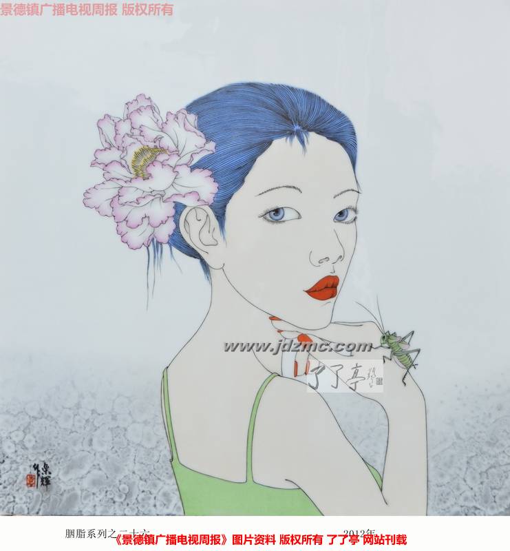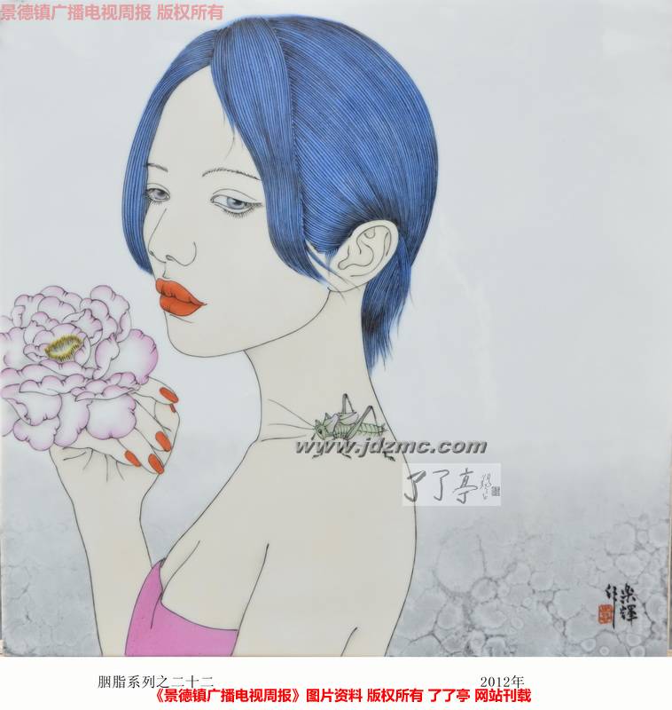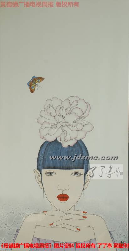 与其说是“女人”统治了袁乐辉的画室,不如说是被“洛丽塔式”《胭脂》系列占领了这里。墙上挂着的,倚墙靠放的大多是《胭脂》系列。淡蓝色的头发,明亮的眼眸却含着几许忧郁,炫目的红唇,白皙的皮肤,指甲上凃着艳丽的颜色,鲜艳的花朵,要么几只或是一群蝴蝶飞舞周围,偶尔还会有一两只蟋蟀作为画中女孩的玩伴出现,背景若隐若现,上半身的特写,发丝清晰可见,整个画面采取了些许变形的手法,但无损画面的美感,这就是《胭脂》系列所呈现的。