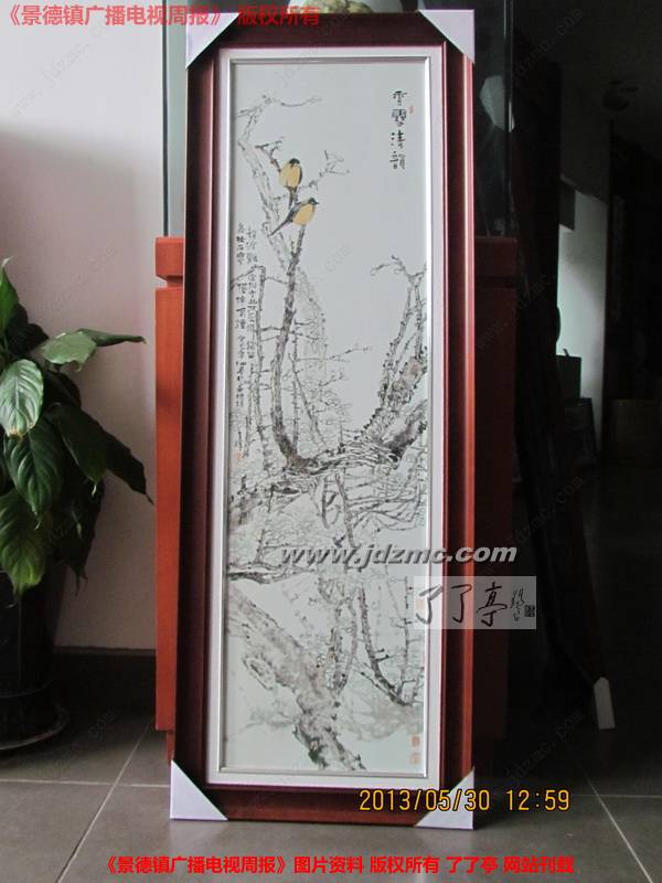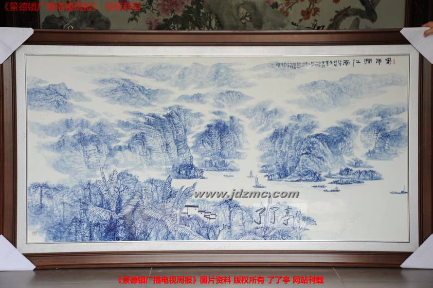 其实境界就是艺术家内在的修养,更是一种精神层面的追求。意既是虚的,又是实的。心有所属,则灵魂不会到处飘荡。李金辉的作品《春雨润江南》横阔的大幅作品,云遮雾绕中,扑面而来的悬崖峭壁和若隐若现的远山,占了整个画面的三分之二。山间流水从山腰间蜿蜒而下,山下江水浩荡、帆影点点,茂密的丛林中,影影绰绰的屋宇若隐若现……细细研读,我们不难发现李金辉渗透着自己的情感在其瓷画中。其笔墨、符号与图式无不渗透出一种胸怀的清净与坦荡,传达出一种山水田园特有的生生不息与枝繁叶茂的感觉。在雄伟壮阔的大自然面前,他的画面空间虽没有人物的点缀,然而透过他笔下的山水,观者体会到的是“怀着乡愁,寻找精神家园”的情绪,寄寓着艺术家一种特有的文化情怀。