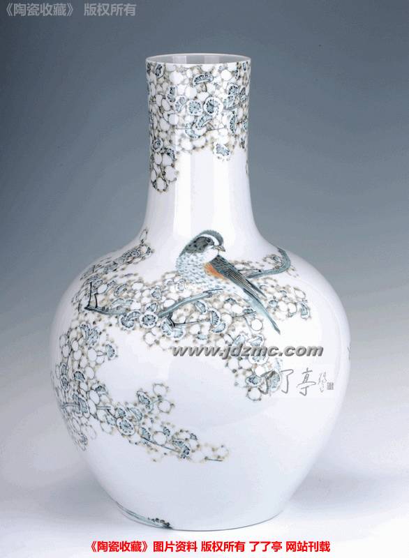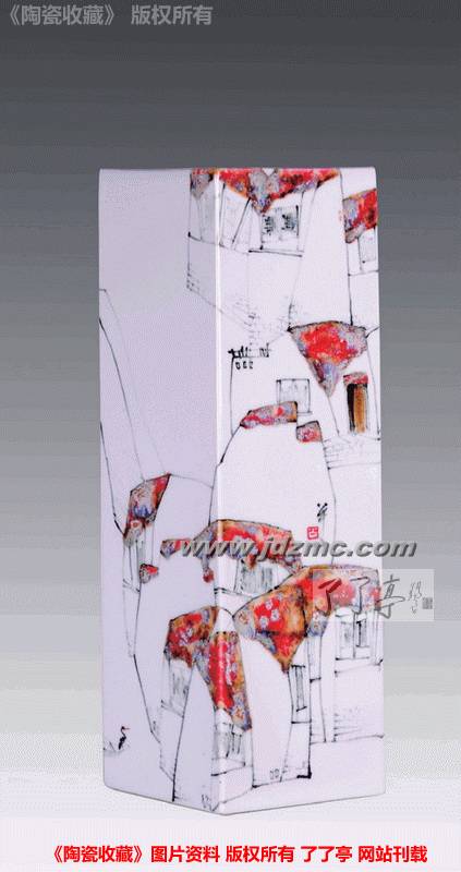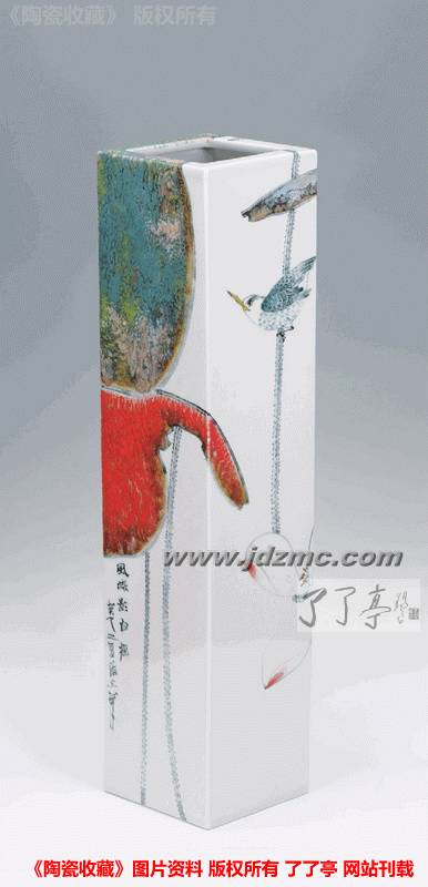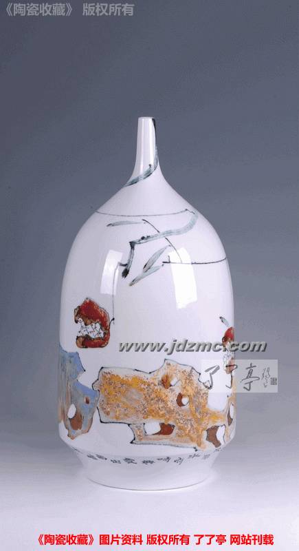 尉涧松将深厚的传统文化修养与笔墨功力渗入釉彩,铺染在造型古朴的瓷土基底上,再经一千三百度以上高温烧炼,借天工之手得窑变之绚烂,出人意料而成其妙,合乎天机而显其奥。尉涧松引入人文思辨和传统修养,使瓷艺意象内涵化了,将东方传统美学精髓恰当运用到现代艺术表达上,其作舒尔朗俊,清美静沁。