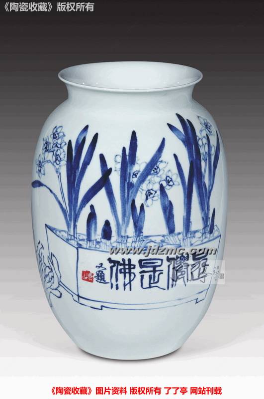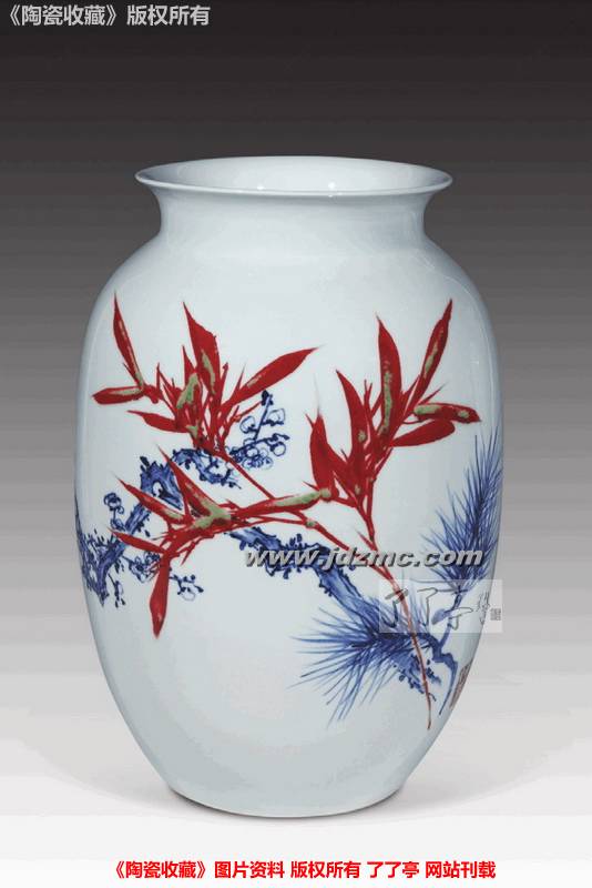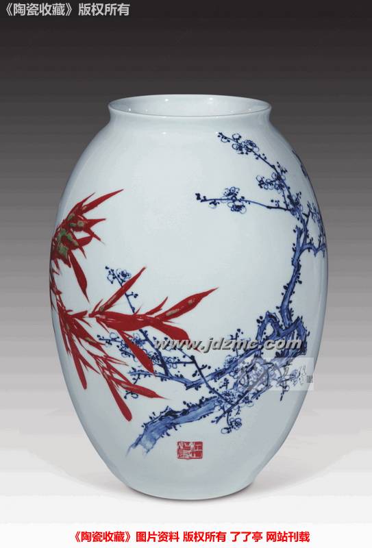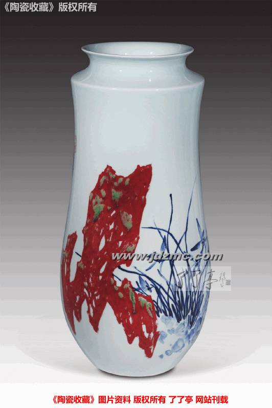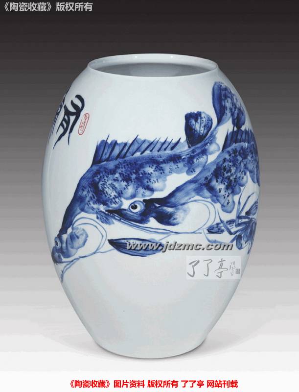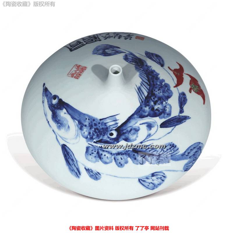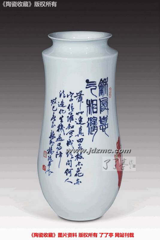艺之深,如渊无底。路之远,无穷无尽。杨随震虽年届古稀,但没有就此停止追寻的脚步。出于对瓷上绘画的热爱,近年来,他仍笔耕不辍,数次来景德镇潜心学习和创作。他认为,书法和国画虽与陶瓷绘画有相通之处,但不同的载体和独特的艺术语言又决定着它们之间的差异性,由宣纸转向瓷器,是一门很高深的学问,又是一重新的磨练,当把书法和国画结合到陶瓷艺术上,就不仅是形式上的绘画,还要从工艺上、思想上、视觉效果上有所突破。杨随震说,陶瓷需耐使、耐玩、耐看,从练泥做坯、彩绘烧炼,到各类料性、不同窑炉、不同温度,各个环节不可不通,作为一个书画家在这些方面又得从头学起。因此,他潜心钻研,在反复地思考、摸索和实践中积累了宝贵的创作经验。近年来,凭借着自身扎实的书法、国画功底,深厚的文学基础,以及对陶瓷艺术的深刻领悟,他创作的陶瓷书画作品,逐渐形成了自己独特的艺术风格,并受到业内外人士的赞赏和喜爱。他创作的陶瓷作品,将诗、书、画、印相结合,将文人画的精髓展现在陶瓷作品上,造就了意想不到的艺术效果。青花釉里红瓷瓶《有鱼图》就充分展现了这些特点。他将纸上水墨化作颜色彩绘,将国画的神韵和意境化作青花釉里红在陶瓷上表现出来,形成了一幅清新淡雅的瓷画。这件作品设色淡雅,造型生动,既继承了中国画的传统笔墨,又创新了陶瓷绘画的形式。杨随震会写书法、作诗、刻印章,他的作品还融入了书法、诗词和篆刻技艺,采众家之长,成一家之风,使自己的作品洗去了匠气,蕴含着书香味,赋予了文人的风骨。
