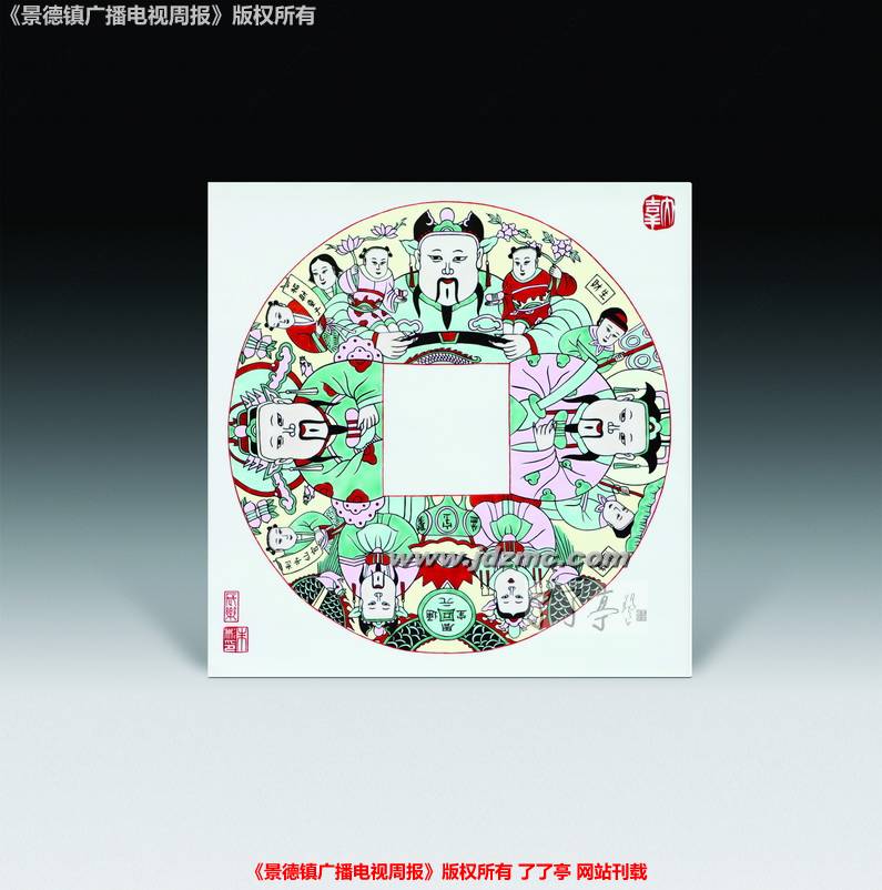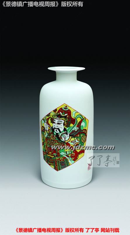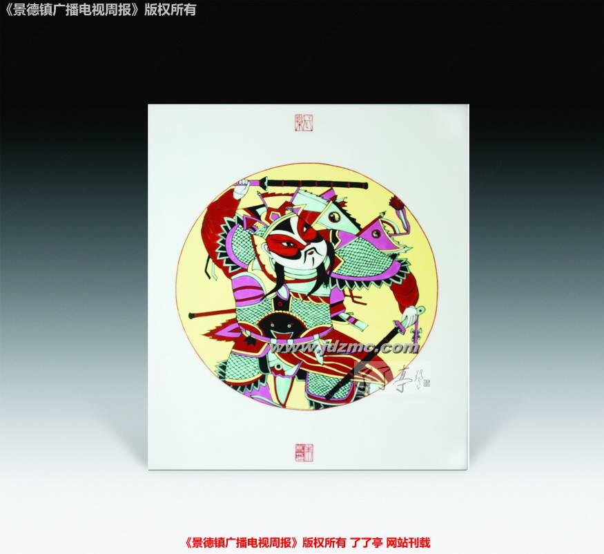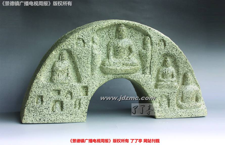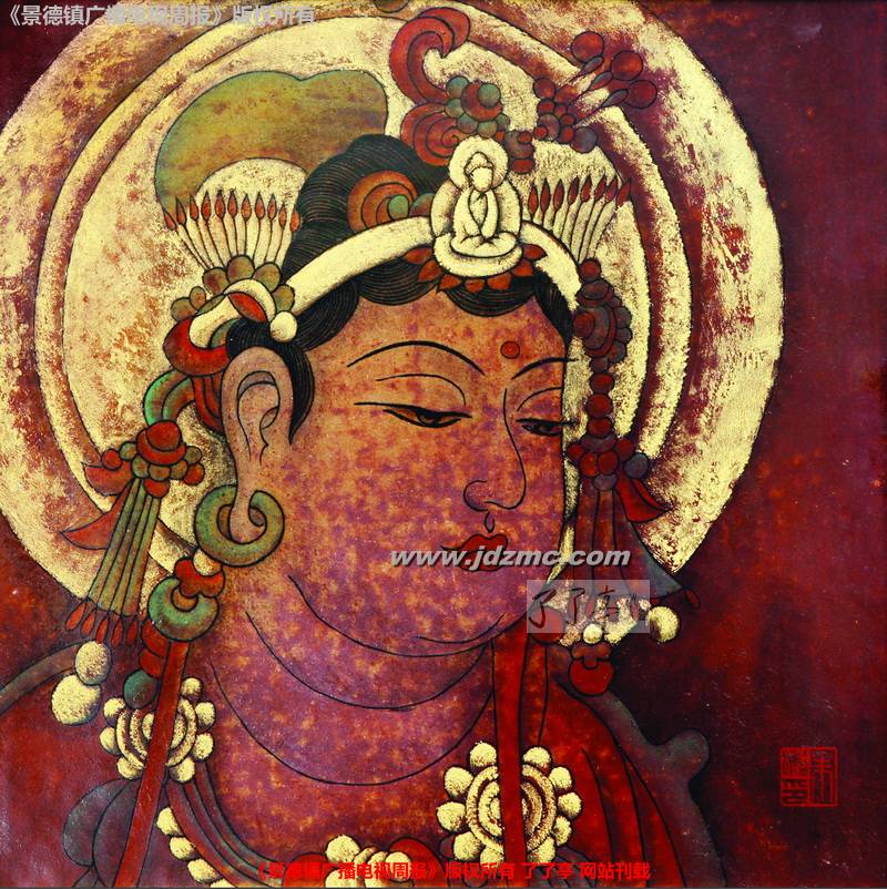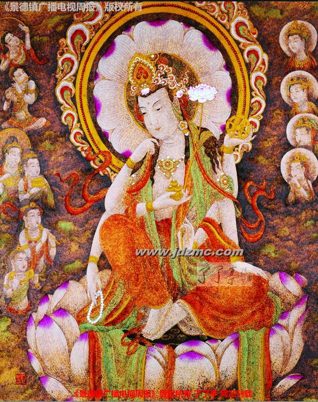 一次偶然,朱彬做了一个颜色釉的镶器,烧制出窑的时候,他发现本来堪称完美的镶器的一个面上出现了一个“不合时宜”的小圆点。除了这个小圆点之外其它都非常好,如果再画上荷花或是其它什么的,这应该会是一件很好的作品。可是,出现这么一个小圆点,让朱彬有些哭笑不得。如何处理这个圆点呢,既不显得做作又自然呢?思考了良久,他发现这个点有些像佛像额头上的那个“点”,干脆抛弃原来的计划,改画佛像。