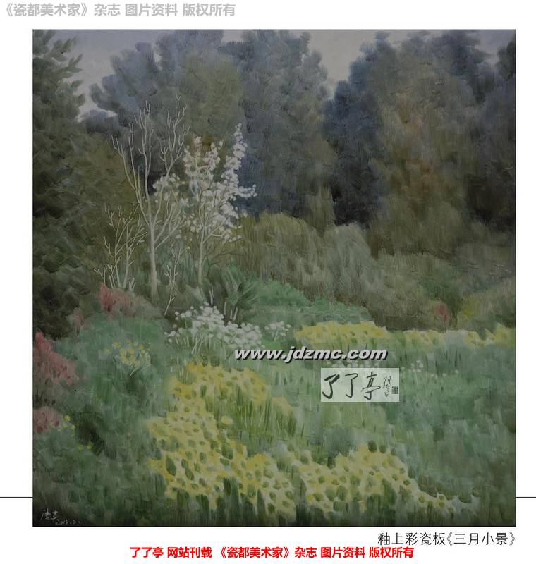 从唐英创作的《昌河边的小路》《汉江弃舟》《河边余晖》《昌江春水》等瓷板画可以看出,他具备深厚的摹写自然的取材写生功力和捕捉事物形态的能力,同时又强调笔触,突出趣味,重视结构,夸张感悟,以心御笔,形神兼备。既有水彩画的透明感,又有油画斑驳厚重的亲切感;既有自然的光影变幻,又有以心造境的阴晴显晦。《赣秋小河》是一幅颇有版画趣味的风景画,线条厚重,力道分明,构图吸取国画背景稳重、主题斜出、静中有动、动中求静的审美趣味,是一次化无形为有形的有益尝试,从目前的陶瓷艺术界看,恐为第一人。