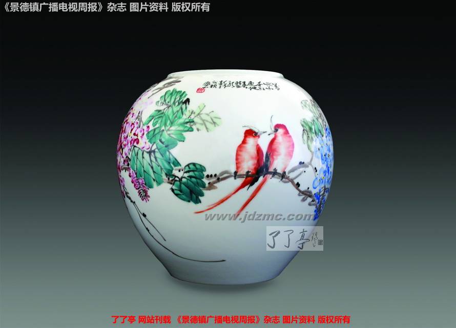 景德镇“珠山八友”时代是景德镇瓷器彩绘艺术水平最高的历史时期。沈书祯先生曾师承“珠山八友”之一的邓必珊先生子嗣邓肖禹先生学花鸟、王云泉先生学山水、赵惠民先生学人物。他的釉上粉彩花鸟装饰技艺在一开始就直接吸收程意亭老先生、邓肖禹先生之用笔、立意、赋彩、位置等;他的釉上粉彩山水,无论取景、构图、施料、着色等与汪野亭老先生、王云泉先生之作品往往呼应;釉上粉彩走兽、虫鱼之精神与毕伯涛老先生、邓碧珊老先生仿佛齐啸山林、共吟同游……和很多“艺术大师”终其一生只选择某一种表现形式作为创作主体相比,沈书祯先生彩绘瓷器题材极其广泛:花鸟、山水、人物、草虫、走兽无不涉猎——尤以花鸟见长,这在景德镇瓷器彩绘领域自“珠山八友”以来实属罕见!