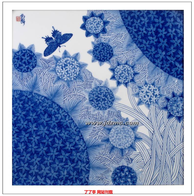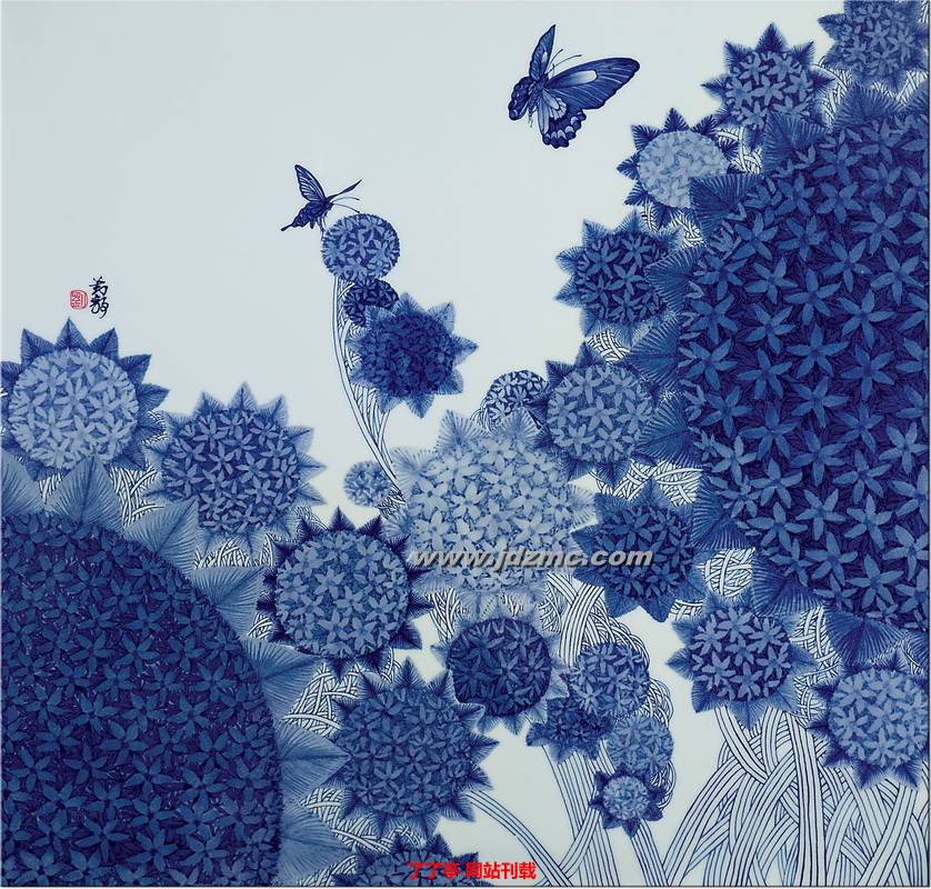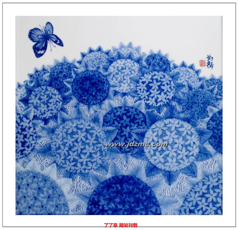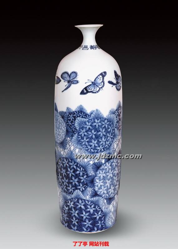青花瓷是中国艺术宝库中的璀璨明珠,是一种釉下彩绘,就是在生坯上绘画,再罩一层透明面釉,送入窑中高温一次烧成(1300度上下)。所绘制图样经过高温处理不易模糊,色彩能够经久不变。青花料溶合于釉质中,在洁白光润的瓷面,透出鲜丽的青色花绘,青白相映,色泽雅素,给人以强烈的视觉冲击力,并且有广泛的审美适应性。从古至今青花瓷装饰丰满、清雅、古朴,深入的反映了人们的日常生活及民族文化。历代传世的青花作品,从画面艺术来看,布局黑白虚实,点线面的运用,讲究笔法、意境和气韵,线条流畅、纹样单独或连续的安排在造型上,形式感强,而在现代的青花瓷装饰中,绣球花在青花瓷坯的演绎,既借鉴了国画技法,也掌握了青花瓷的独特工艺性,从而让国画技法能在陶瓷创作中灵活应用,使创作者的思想灵魂以最佳的方式体现在陶瓷装饰作品中。青花瓷绣球花是创作者将思想和情感在青花瓷坯上体现的产物,体现了青花的韵律美。