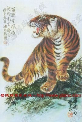又是一个“林风吹雨川光暝,远岸鸬鹚点秋影“的季节,我应邀与几位港商和笔友泛舟玉田水库。湖畔有座小山,三面临水,灌木丛生,红枫举炬,绿松帚风,恰似一头绿毛茸茸的雄狮在俯首饮水。导游告诉我们,它真的叫狮子山,并谣指湖心的一个小岛说,那相传是狮子戏球时把绣球掉到水里了。所以称为绣球岛。话题自然就从物象的形似谈到物象的神似,从外观的特征谈到内在的精神,从狮谈到虎,从虎说到人。大家不约而同地提到了景德镇现代史上一个著名的陶瓷美术家——“毕老虎”。一位姓王的港商是年近而立直年的人。他继承父业接手了一家专门营销景德镇艺术瓷的公司。看我们谈及 “毕老虎”时都表现出由衷敬崇的态度,就轻声读我说:“家父也曾与同道的故友们多次提到毕老先生,敝公司也有毕老作品,但先前曾标写过‘遗世珍品,怒不出售’的字样,后来索性右家父收藏于密室。我少不更事,对此人此画了解甚少,您能否为我解说一二?在众人的 下,我只得尽己所知。先讲了“毕老虎“其实是姓毕名渊明,祖籍安徽黟县,长年客居江西波阳,故毕老有一口浓重的波阳语音。“毕老虎”是景德镇人对他的雅称。而青少年时,毕渊明曾自称—— “天涯客” 黟县地处皖南,北枕黄山,南望白岳,四面群山环抱。是徽州最古老也最小的一个县。秀丽的山川,淳朴的习俗。然而由于山多地少,维生艰难,于是有了“前世不修,生在徽州,十二、三岁,往外一丢”的民风乡俗。“少孤为客早,多难识君迟”成了以一府八县为代表的徽州人共同的人生历程。毕老的父亲毕伯涛,字达,是个清末秀才。他能诗赋曲词,擅丹青水墨,旅居波阳时曾师事当地名家张云生,擅长翎毛花卉,其一生精研金石、诗、书、画,别号“黄山樵子”。在景德镇画瓷画时,遂与王大凡、何许人、刘雨岑等同乡“邂逅集群彦,画笔染素绢”,参加了以王琦为首的“月圆会”,即后人称之的“珠山八友”。从此,这“谈笑有鸿儒,往来无白丁”的生活环境,对毕渊明的 艺术人生,产生了极深刻的印象。他在文章中写道:“笔者幼承庭训,徒读父书,浪掷居诸,难承衣钵,为可愧耳。”这是他自谦之辞。但字里行间,饱含着他对父亲的挚爱,对父亲的尊重。 1931年,只读了四年私塾的14岁的毕渊明跟随父亲来到景德镇,为了专心学艺,毕渊明在一家红店里白天帮工打杂,晚上在一间破阁楼上练画。三年来,他每晚是身不离画桌,手不离毫管,累了、困了,就和衣而卧,从不打开被子睡觉,以致于家母为他拆洗被子时,居然发现有几只老鼠在被子里安窝了。当毕渊明把自画自填的一块粉彩《芦雁秋声图》八寸瓷板画递与父亲时,父亲惊喜的见到,两雁在寒沙折芦之间,一雁已息落,而一雁盘旋欲下,相望相依,宛如一对旅外的情侣。一支芦花,秃笔蓬松,隐约渚沙,墨色枯渎。而画的鸿雁,则是墨中带赭色,头颈弯曲,羽毛用浓淡轻重的不同色彩层层晕染,十分细腻,不仅形神肖似,而且质感柔软润泽,无不情趣横溢,把工兼写的国画技法成功地运用在粉彩的表现形式之中。连珠山八友的花鸟画大家程意亭看了,也啧声称赞,连声说“后生可畏”。问他为什么首幅瓷画以芦雁为题时,渊明坦言说:“徽州人在外地,好比飞鸣宿食的飞雁,所谓‘相伴芦花与荻花,水云深处便是加。‘还有,问子游何乡,戢翼正徘徊。’这不正是我们徽州人浪迹天涯的写照吗?!思乡的情结,负重的精神,自强的信念,使得毕渊明在颠波离散之际,贫困潦倒之中虽鬻文卖画,但铮铮傲骨,不向权贵俯首。毕渊明在他的瓷画纸幅上题号“天涯客”,其诗书画印显示出他横溢的才华。1935年,他先后应聘于浮梁陶瓷职业学校、浮梁国立艺术学校和湖南衡阳瓷彩学校执教,还兼任过景德镇《晨钟报》副刊、《陶业日报》副刊编辑,19岁那年并成功地举办了个人金石书画作品展。“天涯客”在瓷坛画苑崭露头角,为众人瞩目。然而有谁知道,毕渊明由于全身心地执着追求而疲劳过度,才年届不惑便白了头发,对此,毕渊明却哈哈一笑,说:从前“天涯客”,今天又是一个—— “白发少年” 珠山八友中的领袖人物王大凡曾对毕伯涛父子有诗评赞:“胸中只爱写灵生,点飞花枝气纵横,有子渊明能继志,诗书画刻不虚声。”并欣然将自己的爱女许配毕渊明,与毕伯涛结成了儿女亲家。从此后,毕渊明在瓷绘艺术上更加得益于“珠山八友”叔伯们的帮助和传授,他不仅画花鸟,也画山水,画人物,也画鱼藻草虫。正当他声誉鹊起之时,毕渊明却改变了他娴熟的创作题材,专工灵禽猛兽。老丈人顿时愕然,他回答说:“珠山八友的画风作品是非常卓越的,但题材却有局限,众多名家中竟无一人工于走兽。艺术贵在创新,既然画走兽是个冷门,那我就去开垦这个新地吧。”一番话说得王大凡不住地点头赞许。 虎为百兽之首。毕渊明画虎先以古人画谱为本,总要仔细揣摩半天,然后根据陶瓷材质的特点,找出适当的表现技法。他很注重写生。当时景德镇没有动物园,他就省吃俭用,攒下路费数次专程到省城南昌,在动物园观察写生。然而,他总觉得动物园的虎是囚虎,毫无生气和野性。有一次,毕渊明听说有名的法国海琼伯马戏团到了上海,在妻子的支持下,他几乎把家中所有的积蓄都倾囊而出,赶到上海观赏虎豹演出。这回观摩对他是大有收益,他不仅看到了虎姿虎威,还观看到了虎的游走、跳跃、坐立的动态。于此同时,他借鉴画虎