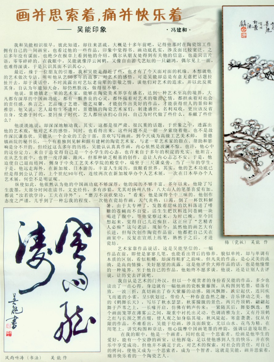 我和吴能相识很早,彼此知道,却往来甚疏。大概是十多年前吧,记得他那时在陶瓷馆工作拥有自己的一间画室,也看过他的一些作品, 印象中觉得书、画功底扎实,涉及面比较宽泛。之后多年没有谋面,也绝少在报章上看到他的介绍。偶尔从朋友处得到有关他的信息,也是只言片语,零零碎碎的。在我眼中,吴能就像浮云闲鹤,又像自由游弋艺坛的一只翩鸿,偶尔见上一面,也难得深谈,于是只识其面不识其心。 最近,缘于一位朋友的引邀,我和吴能走得近了些,也才有了今天面对面的机缘。本想就他的艺术做次专访,听听他从艺30多年的故事,对艺术的感悟。可是吴能却总是有意无意把话题拉扯开去,却于谈话中,不时流露出对艺坛老前辈的崇敬之情,谈他们对艺术的追求, 并以此反观其身, 自认为年逾知天命,却仍然肤浅,做得很不够。 他说,景德镇老一辈的艺术家,能够在陶瓷美术界享有盛名,达到一种艺术至高的境界,大凡都有深厚的中国画功底,都有一颗善良的心灵,都怀揣着对艺术的敬畏之情,都担承着对社会的责任感。换言之, 艺品缘于艺德,德艺双馨,才能创作出美好的作品,才能获得世人的墩仰和推崇。他又说,艺人最怕生不逢时,景德镇的陶瓷艺术家们,躬逢盛世, 名利双收,更应该反省自身,受惠于时代,要回报于时代,艺人都应该扪心自问,自己为时代做了些什么,奉献了些什么? 他淡淡地说,却深深地触动我。其实,这都是很严肃、很沉重的话题,于世象之中,透露出他的艺术观,他对艺术的感悟。同时,也看得出来,这些问题不是一朝一夕萦绕着他,也不是故作深沉谦恭状。吴能从一个企业的工会干部,喜欢写写画画,到今天成为高级工艺美术师,景德镇画院的秘书长,一个有着独到见解和颇有建树的陶瓷艺术家,与老一辈艺术家的指点、帮助和影响是分不开的。但经过这么多年的历练,吴能认认真真作画, 内心依然是波澜不惊,也许,他心中的这份定力,来自于总觉得自己是一个小学生的心态, 也许来自于多年的积淀的充实。他坦言,在从艺生涯中,也曾一度浮躁、跟风,但那种缺乏根白小根基的创作, 总让人内心忐忑不安。于是,他迫使自己退而结网,侧身于中央工艺美术学院的殿堂中,端坐于三尺课桌旁, 当了一年的学生。于是,他远走海外,在新加坡、 日本游历, 丰富人生阅历,放眼看世界。其实,他的艺术功底已经是得到公认了的,上个世纪90年代,连续两次在新加坡举办个人艺术展,一次在日本举办个人艺术展,何尝不是明证呢。 纵使如此,他依然认为他的中国画功底不够深厚,他的阅历不够丰富。多年以来,他除了写生泼墨,大部分时间在读书,文史经传,多有涉猎,尤其对扬州八怪,八大山人的笔墨喜爱有加。都说“汝若欲学诗,工夫在诗外”, “磨刀不误砍柴功, ”看来,他是深得个中三味的。他创作态度之严谨, 几乎到了—种忘我的程度。—次他在瓷坊作画,天气炎热, 口渴,倒了一杯饮料解