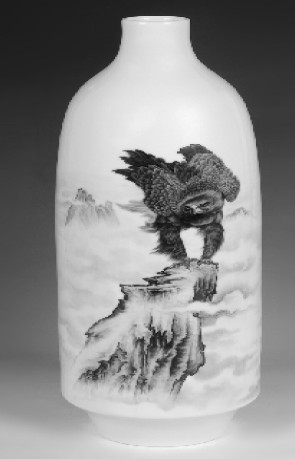 振翮一飞云天外 ..品读陈盛良陶艺作品《啸风》 .寒山几堵,风低削碎中原路。秋空一碧无今古。.初赏陈盛良的陶瓷作品《啸风》,很自然地忆起了被誉为清初词坛第一人陈维崧的名画《咏鹰》。一首流传百年的名词,一幅新近问世的瓷画,却多有异曲同工之妙。看《啸风》,迎面而来的是.苍鹰.、.寒山.、.秋空.,让人感受到的是秋山之肃杀、山峦之高峻、天地之辽远、苍鹰之矫健。画面运用了衬托的手法,借用壁立的寒山、空旷的天地、澄碧的秋空等场景来衬托鹰的形象。这一简洁的题材内容,却勃发着精神的张力,表露出坚毅的意志,流露出雄大奇伟的风格,让人感到震撼的力量。 整个《啸风》的画面,完全可以用.功力深、立意高、构图巧、笔墨精、题跋趣.来概括。作者笔触变化丰富,表现山石的粗糙、坚硬、千钧之重,用笔凝重。对于山石的结构关系,通过凹凸转折,皱裂纹路表现的一清二楚。尤其是苍鹰的眼睛和猢狲的眼睛相似,耸起身子的样子,好像是在想攫取狡猾的兔子似的,从而刻画出苍鹰搏击前的动作及其心理状态,真是传神之笔。在表现技法上,工中有写,写中有工。中锋、侧锋和散笔,浓墨、淡墨和渲染,都有机地结合在一起,虚实相间,层次分明,气氛惨淡,结构精到而准确,作品给人以强烈的艺术感染力。鹰是世界上飞得最高的鸟类,翱翔于万里云天,具有坚强生命力,中国古代的文艺作品,常常用鹰来象征人的精神力量和高风傲骨,陈盛良先生这种题材的选择,无疑是受生活的启示,以及个人的精神世界所使然。陈盛良出生于陶瓷世家,从小就受到祖父、民国著名陶瓷艺术家陈隆辉艺术熏陶,后考入陶瓷专业:校后,精心学习绘画技法和颜色调配,主攻花鸟、走兽绘画,尤其注重作品意境的构造。在他的陶瓷绘画作品尤其是鹰图中,令读者不仅体察到.声色俱厉.的雄健之美,尤其可感受到.顽者警、懦者立.的精神震撼。