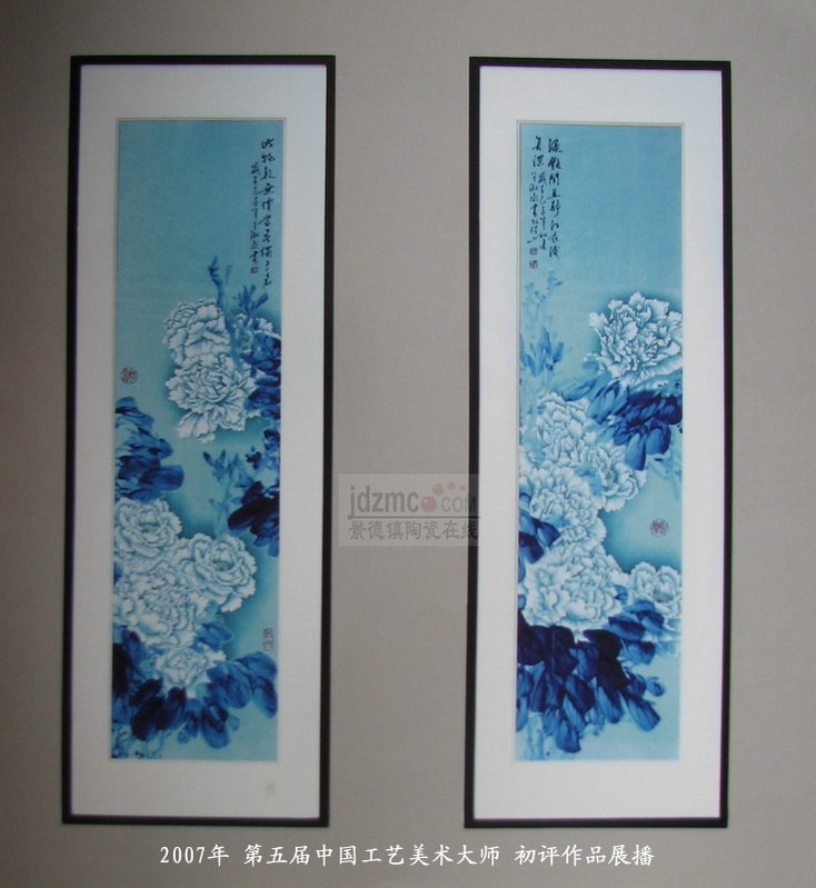 07年国大师初评作品 影青釉底青花斗彩四条屏瓷板《白牡图》王淑凝